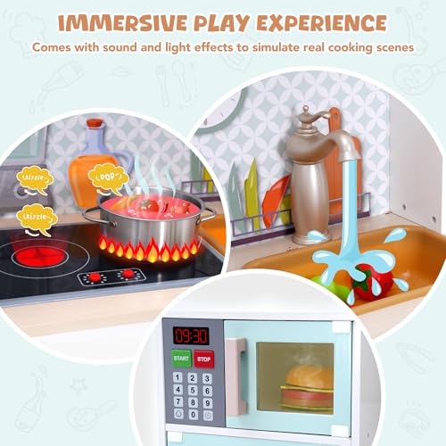 The size of the toy kitchen is perfect for toddlers and preschoolers. It’s big enough to feel like a real kitchen, yet compact enough to fit in smaller spaces. The wood finish also makes the set look nicer in a room compared to all‑plastic kitchens.