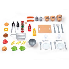 The grill lid opens and closes, the oven has movable knobs, and the sink’s water system (which uses real water!) is a big hit with kids, letting them wash up just like the grown-ups. A small work surface acts as a prep area, and there’s even a barbecue area for “grilling” the included plastic food items. It’s a thoughtfully designed layout that promotes both solo and cooperative play. 🍔🍳🧼